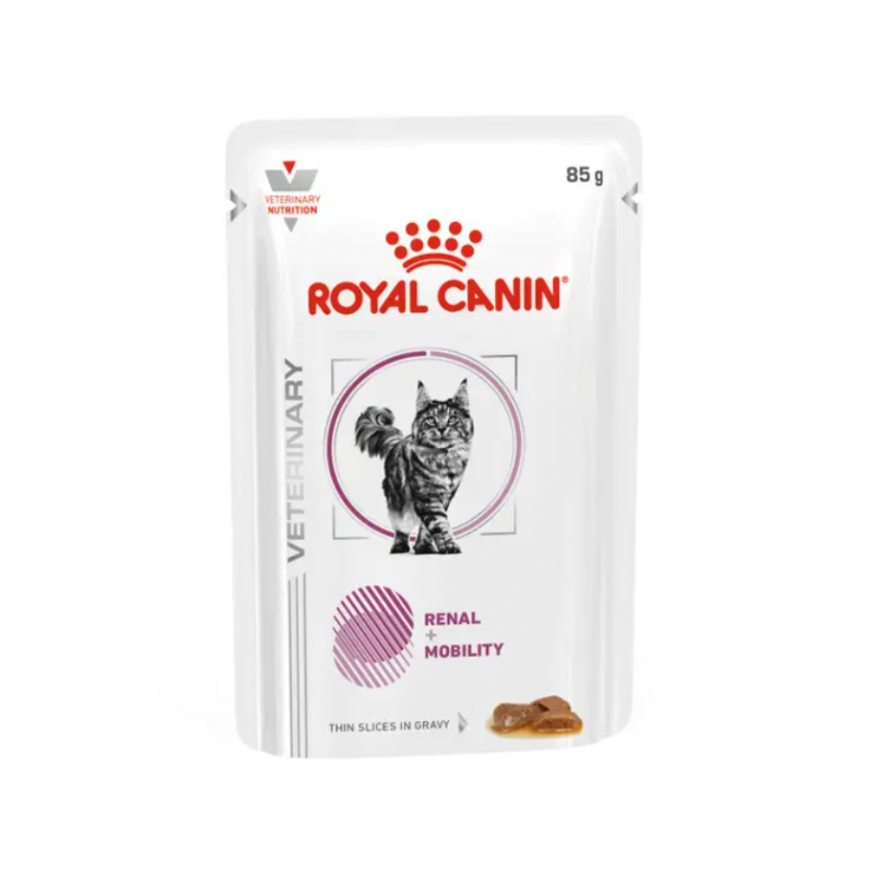 ROYAL CANIN® RENAL + MOBILITY õhukesed viilud kastmes on kassidele mõeldud täisväärtuslik eritoit, mis toetab neerutalitlust kroonilise neerupuudulikkuse korral ning liigeste ainevahetust osteoartriidi korral. Kvaliteetsed valgud ja piiratud fosforisisaldus, kõrge DHA ja oomega-3 rasvhapete kogusisaldus, kõrgem metioniini ja mangaani sisaldus ning piisav E-vitamiini sisaldus. SOOVITUSED: enne kasutamist ja enne toidu kasutusaja pikendamist tuleb konsulteerida loomaarstiga. Kroonilise neerupuudulikkuse korral neerutalitluse toetamiseks andke seda toitu loomale esialgu kuni kuus kuud. Osteoartriidi korral liigeste ainevahetuse toetamiseks andke seda toitu loomale esialgu kuni kolm kuud.