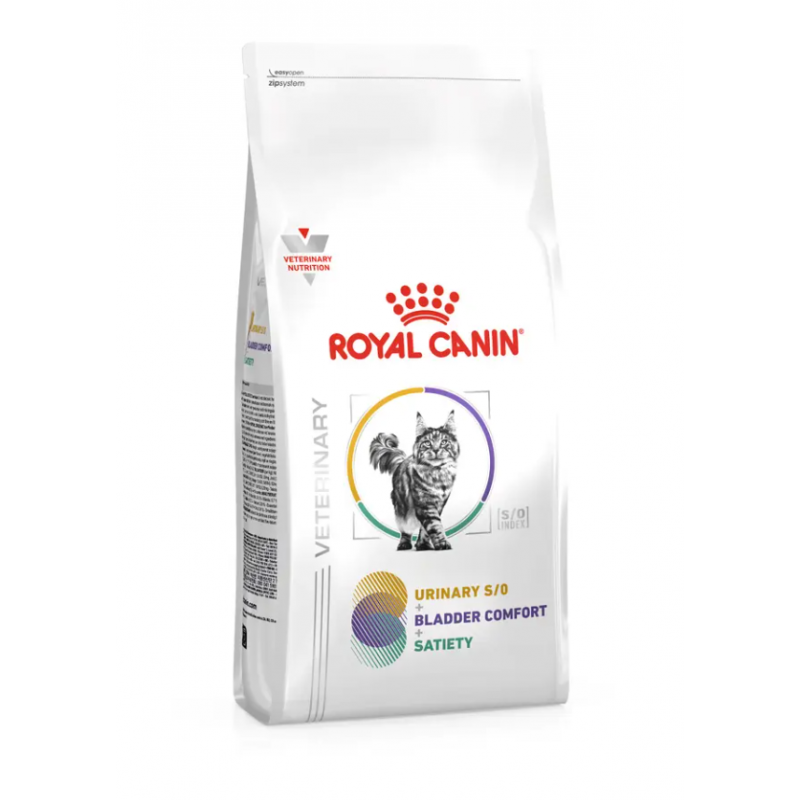 ROYAL CANIN® URINARY S/O + BLADDER COMFORT + SATIETY kuivtoit on täisväärtuslik dieettoit kassidele, mis on koostatud struviidikivide lahustamiseks, struviidikivide taastekkimisohu vähendamiseks, kasside alumiste kuseteede haiguse jaoks ja liigse kehakaalu vähendamiseks. Struviidi korral uriini küllastuvust vähendavad või metastabiliseerivad omadused ja/või uriini happelisust soodustavad omadused. SOOVITUSED: enne kasutamist või kasutusaja pikendamist soovitatakse konsulteerida veterinaararstiga. Struviidikivide lahustamiseks andke seda toitu 5 kuni 12 nädalat ja struviidikivide taastekkimisohu vähendamiseks esialgu kuni 6 kuud. Andke kuni saavutatakse soovitud kehakaal ja pärast seda juhul, kui see on vajalik soovitud kehakaalu hoidmiseks. Kassidele soovitatakse dieedi alguses üleminekuperioodi. Tõhusa kaalulanguse saavutamiseks või ideaalse kehakaalu hoidmiseks ei tohiks soovitatavat päevase energia kogust ületada.